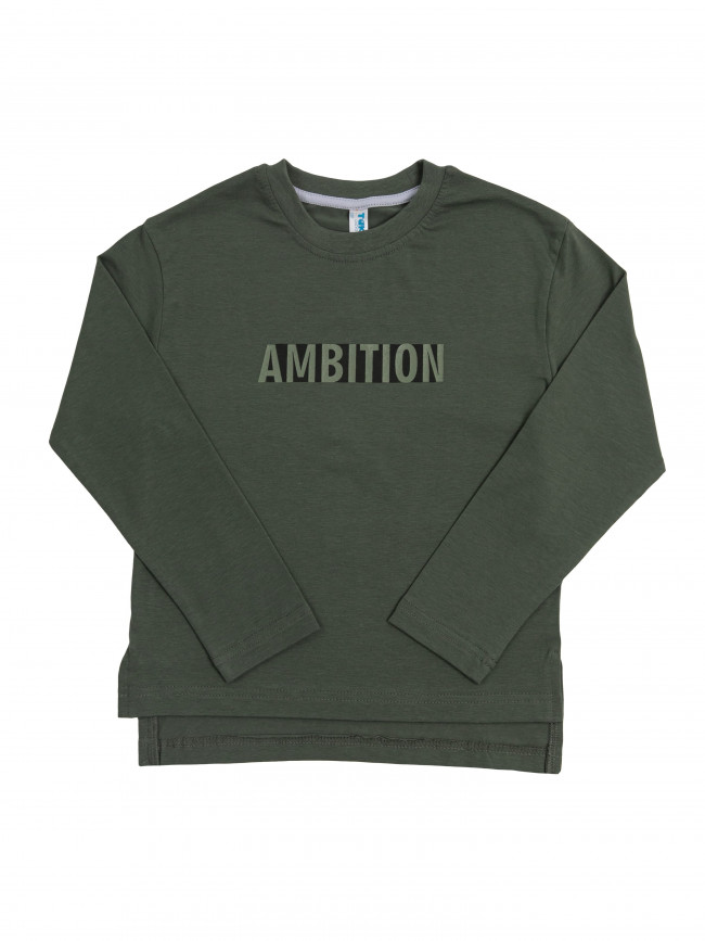 Однотонный лонгслив трендового оттенка зеленого цвета - хаки для мальчика с акцентной надписью заглавными буквами AMBITION станет одновременно и удачной базой в гардеробе ребенка, и стильным акцентом, который не останется незамеченным.