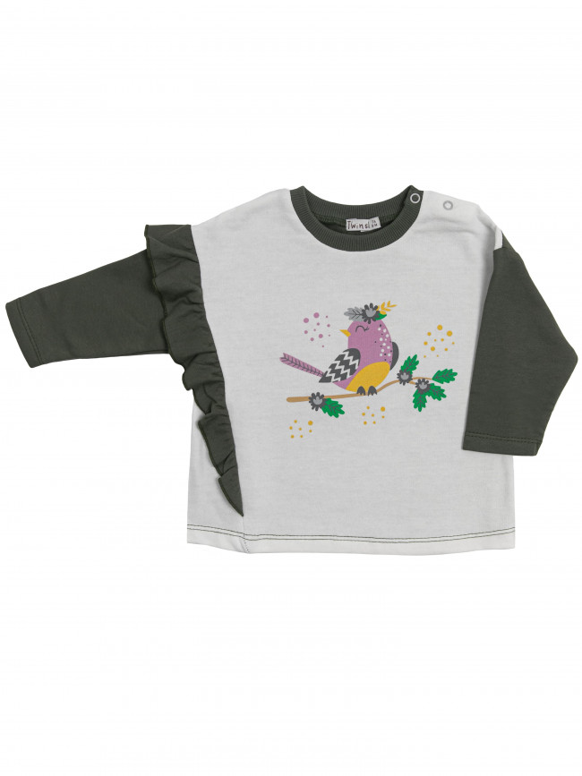 Для удобства одевания на плече предусмотрена застежка на кнопках. Горловина, длинные рукава и крылышко-оборка от плеча до низа изготовлены из контрастного материла цвета хаки, стильно сочетающимся с милым и ярким принтом в виде волшебной птички.