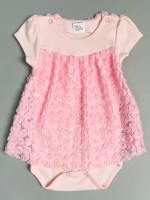 Нарядное двуслойное нежно розовое боди-платье с коротким рукавом для девочки выполнено из 100% хлопка интерлок и гипюрового второго слоя, украшенного объемным кружевом из россыпи мелких розочек. Такое боди идеально подойдет на праздничный выход круглый год, для фотосессий, торжественное мероприятие, а также на лето для запоминающихся прогулок. Трендовое кружево из маленьких розочек, летящий воздушный кружевной внешний слой А-силуэта, рукава-фонарики делают эту модель нарядной яркой основой для модной сезонной капсулы детской одежды. Эргономичный крой под подгузник — комфортное решение для активных малышек. Крепкие кнопки на плечиках и между ножек помогут быстро одеть ребенка или ловко сменить подгузник. В таком боди платьице малышке будет комфортно лежать, переворачиваться, учиться новым умелкам и быть модной с первых дней жизни. Боди-платье идеальный подарок новорожденным малышкам на выписку, или девочкам постарше на крестины, на день рождения, на именины, на Новый Год, на любые важные для вас праздники.