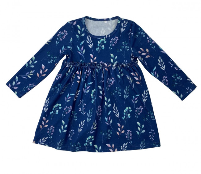 Нежное, ярко-синее платье с длинным рукавом и отрезной талией, украшенное декоративной рюшей по поясу, подойдет для девочек на каждый день и будет вполне уместно на торжественном мероприятии. Нежный принт в виде едва распустившихся веточек сирени и свежих листочков задает весеннее легкое настроение. Современная и очень стильная модель. Платье выполнено из хлопкового трикотажа — кулирка. Это мягкая, приятная на ощупь, гипоаллергенная и очень практичная ткань, которая отлично показывает себя в носке и эксплуатации. Такое платье в сочетании с белыми кроссовками или кедами и легкой джинсовой курточкой станет замечательной основой для создания ультрамодного весеннего детского образа.